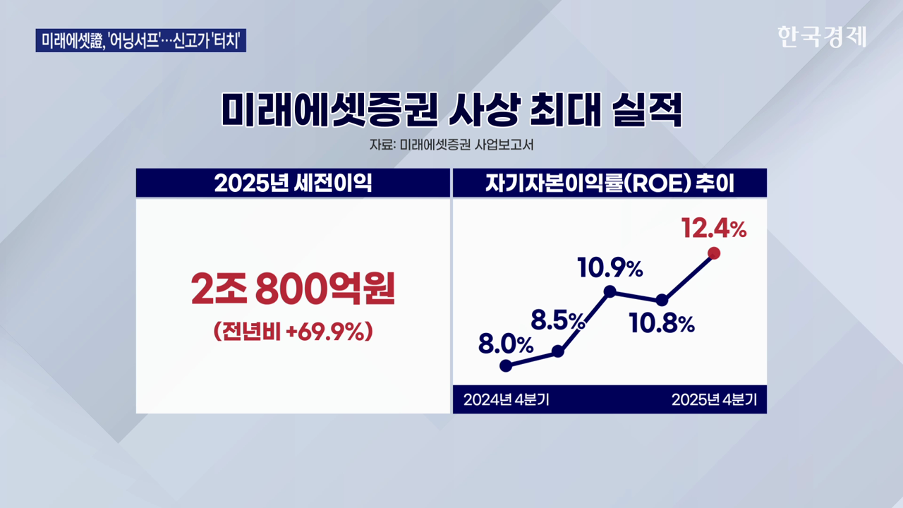 미래에셋증권의 2025년 연결 기준 세전이익은 1년 전보다 70% 늘어난 2조800억원을 기록했습니다. 사상 최대 실적입니다. 자기자본 역시 12조 1천억원에서 13조 5천억원으로 늘었고, 자본 효율성을 보여주는 ROE도 12.4%까지 올라오면서 내실까지 챙겼다는 평가입니다. IB를 제외한 대부분의 사업 부문에서 호실적을 기록했습니다.