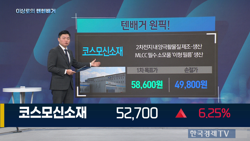 코스모신소재는 양극활물질과 MLCC 소모품인 이형필름을 생산하며, 목표가는 5만 8600원, 손절가는 4만 9800원으로 제시됩니다.