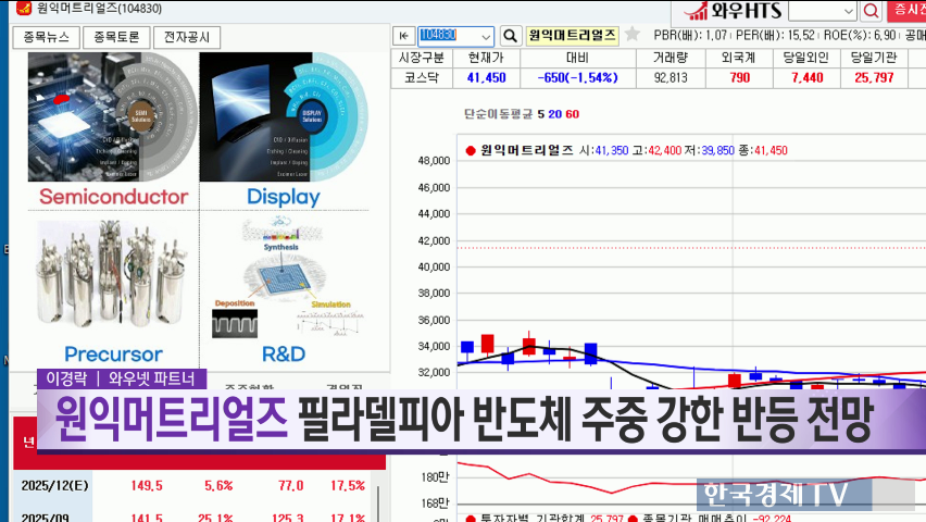 이광무 파트너는 LS를 최종 픽으로 선정했으며, LS는 미국의 현지 진출과 국내 전력망 개선을 위한 대규모 프로젝트 참여로 성장이 예상된다고 분석했습니다. 특히 LS는 해저케이블 분야에서 강력한 경쟁력을 보유하고 있으며, 국내외 정책 변화에 따른 수혜가 기대됩니다. LS 주가는 현재 박스권 상단을 시험 중이며, 기관과 외국인의 수급이 긍정적 신호를 보이고 있습니다. 두 전문가는 모두 반도체 미세화에 따른 화학 소재 사용 증가와 이에 따른 실적 전환 가속화를 이유로 원익머트리얼즈를 최우선 종목으로 꼽았습니다.
