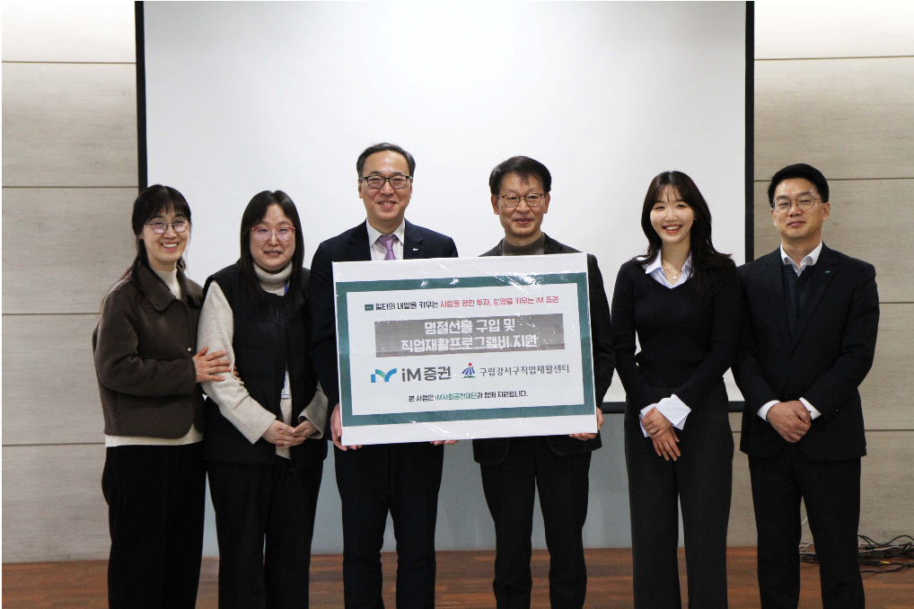 이번 사회공헌 활동은 설 명절을 맞아 발달장애 근로인의 명절 소외감 해소와 정서적 안정감을 지원하기 위해 마련됐다. iM증권은 지난 11일 구립강서구직업재활센터에서 iM증권 정호철 경영전략본부장과 구립강서구직업재활센터 조기형 원장 등 관계자들이 참석한 가운데 1천만 원의 기부금을 전달했다.