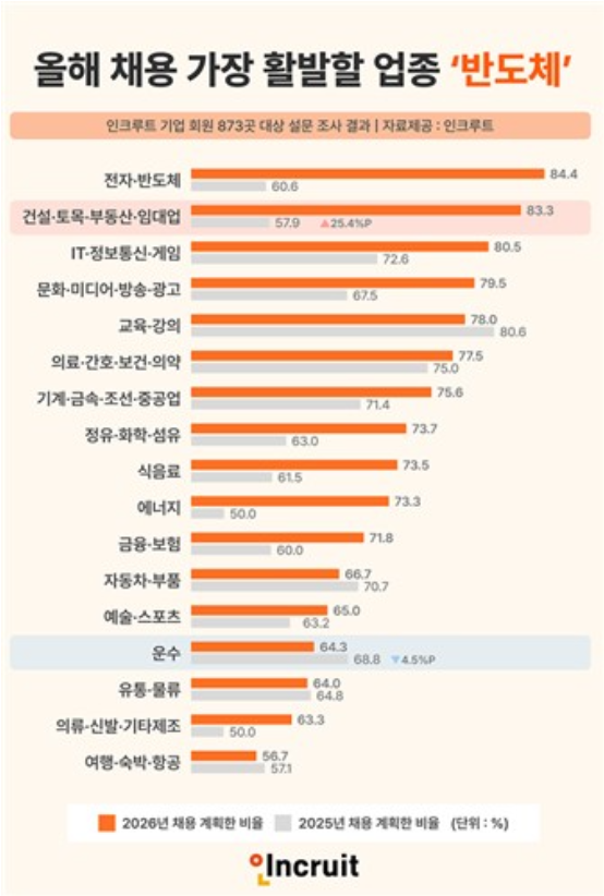 인크루트가 873개 기업(대기업 102곳·중견기업 122곳·중소기업 649곳)의 '2026 업종별 채용 계획'을 조사한 결과, 올해 대졸 신입사원 채용이 가장 활발할 것으로 예상되는 업종은 전자·반도체(84.4%)였다. 이는 전년 대비 23.8%포인트 상승한 수준이다.