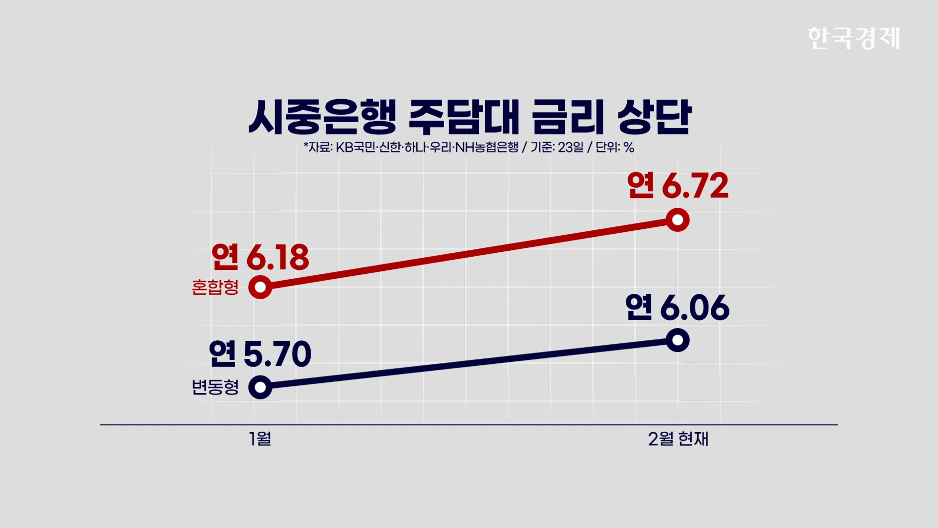 23일 기준 5대 시중은행의 주담대 변동형 금리는 연 3.66~6.06%, 5년 혼합형 금리는 연 3.83~6.72%를 나타냈는데요.