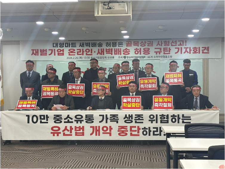 한국수퍼마켓협동조합연합회는 26일 오후 1시 30분경 서울 여의도 중소기업중앙회 상생룸에서 전국 46개 지역 수퍼마켓협동조합 이사장들이 참석한 가운데 '재벌기업 온라인·새벽배송 허용 규탄 기자회견'을 열고 같이 밝혔다.