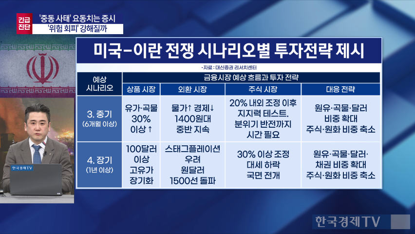 ● "이란 사태 한달 이내 안정...증시 추세 상승 전망" 전문가들은 이란 사태로 인해 코스피가 급락을 겪고 있지만, 이는 일시적인 현상이며 장기화되지는 않을 것으로 예측하고 있습니다. 호르무즈 해협의 완전한 봉쇄 가능성은 낮으며, 이로 인한 전면적인 경제 타격은 없을 것이라고 평가하고 있습니다.