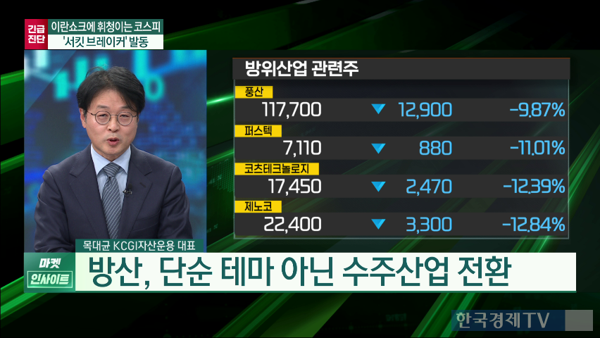 ● "이란 전쟁 불구 펀더멘털 변화 없어...방산·해운 트레이딩 기회" 코스피와 코스닥 양대 지수가 서킷 브레이커까지 발동되며 크게 하락하고 있습니다. 전문가들은 이러한 급락이 최근 급격한 상승 후 자연스러운 조정 과정으로 해석하고 있습니다. 이란 전쟁 이슈로 인해 외국인 매도세가 강해지며 주가 하락을 가속화하고 있지만, 기업 펀더멘털에는 큰 변화가 없다고 보고 있습니다.