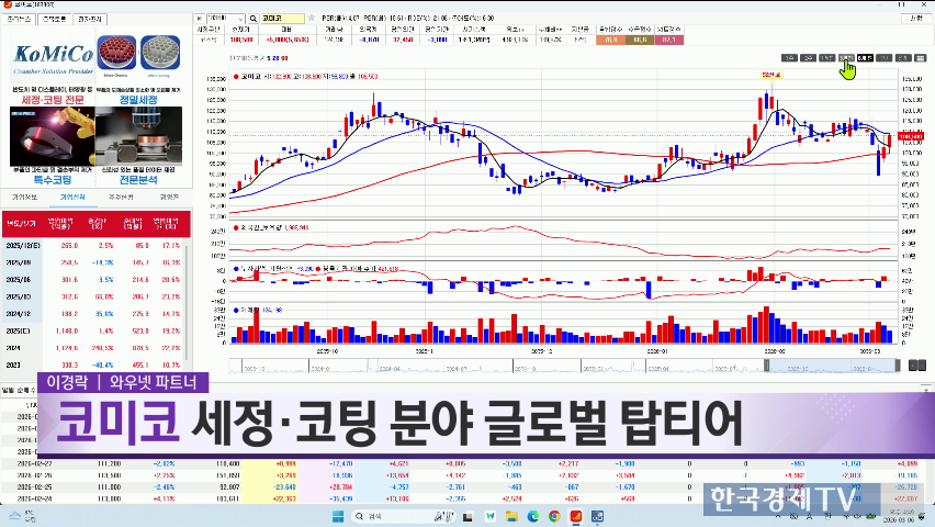 이경락 대표의 코미코부터 자세히 살펴보겠습니다. 코미코는 대미 투자와 관련된 종목으로, TSMC가 주요 고객사입니다. TSMC가 일본에 공장을 지으면 코미코는 세정·코팅 공장을 옆에 짓습니다. 삼성전자도 공장을 짓게 되면 코미코는 그 옆 라인에 공장을 지을 수밖에 없습니다. 반도체 미세화 시대가 열릴수록, 반도체 단가 경쟁이 심화될수록 세정·코팅의 중요성이 커지며, 코미코는 최고의 수혜주로 떠오를 수밖에 없습니다. 코미코는 세정·코팅 글로벌 톱티어로, 3위 안에 드는 기업입니다. 시가총액이 작지만, 메모리 및 비메모리를 아우르는 유일한 기업으로 평가받고 있습니다. 올해 1분기와 2분기에 어닝 서프라이즈가 예상되며, 영업이익도 작년 하반기보다 증가할 것으로 보입니다. 주가는 박스에 갇혀 있지만, 서서히 반등하고 있으며, 시가총액이 1조 원대라는 점은 시사하는 바가 큽니다. 코스닥에 있는 종목이므로, 서서히 치고 나가면 좋은 수익이 날 가능성이 높습니다.