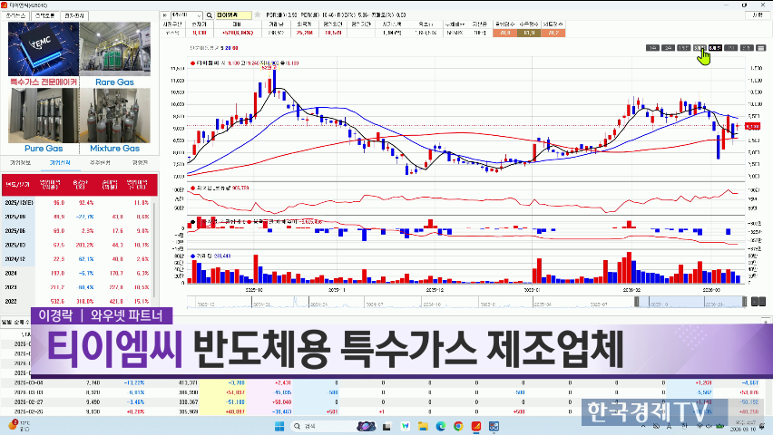 이경락 대표는 티이엠씨를 파이널 픽으로 선정하며, 반도체 공정에 사용되는 특수가스 생산 업체로서 반도체 미세화와 후공정 확대로 인한 수요 증가를 전망했습니다. 티이엠씨는 자사주 상여금을 통한 주식 전환 및 배분을 활발히 진행 중이며, 이는 큰 모멘텀 신호일 가능성이 있다고 설명했습니다. 두 전문가는 치열한 논의 끝에 결국 이경락 대표의 '티이엠씨'가 파이널 픽으로 결정되었음을 밝혔습니다. 이경락 대표는 티이엠씨가 저평가된 종목이며, 앞으로의 추이를 계속해서 체크할 계획이라고 전했습니다.