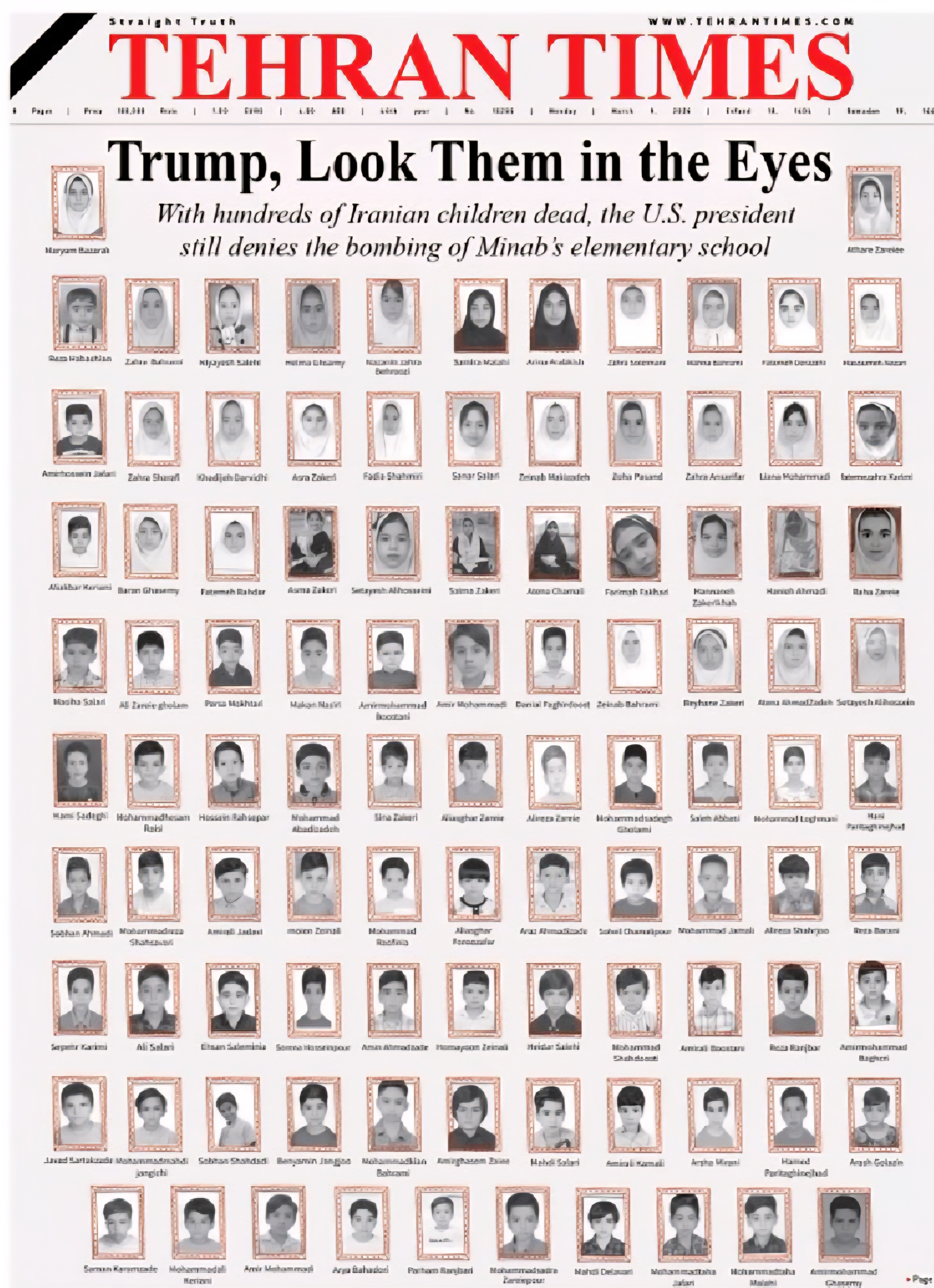 이란 영문 일간지 테헤란 타임스는 9일 발행한 신문 1면을 폭격으로 사망한 미나브 초등학교 학생 100명의 얼굴로 채웠다. 사진 위로 '트럼프, 그들의 눈을 똑바로 봐라'라는 제목이 달렸다.