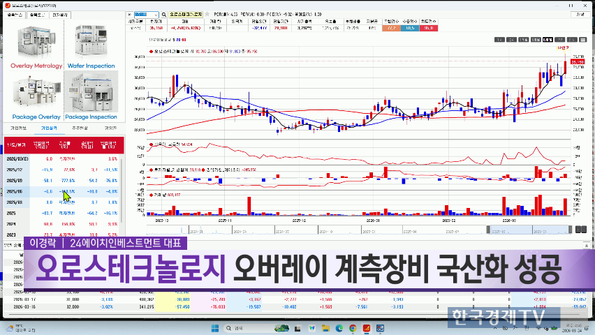 이경락 대표는 KLA의 EUV 노광 공정 계측 장비를 국산화한 오로스테크놀로지를 선택했다. 그는 전공정과 후공정 모두 대응 가능한 기술적 강점과 HBM 및 하이브리드 본딩 분야로의 확장 가능성을 높이 평가했다. 또한, 최근 기관 투자자들의 매수세와 차트의 긍정적 신호들을 근거로 제시하며 실적 턴어라운드를 기대했다.