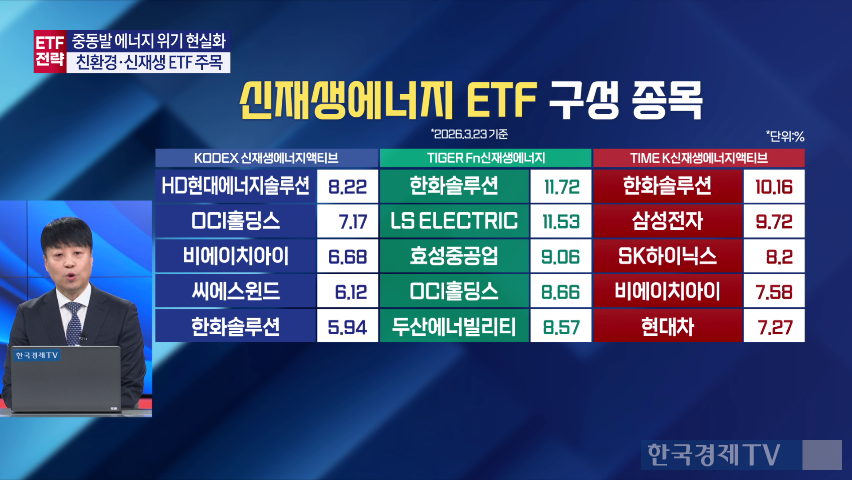 ● 핵심 포인트 - 이번 주 코스피는 -2.6%, 코스닥은 -3.6% 수익률을 기록했으나, 최근 이틀간의 상승세로 플러스 전환 예상됨. - 홍콩 및 상해종합 지수는 각각 5%, 6%대 낙폭을 보였으나 점차 회복 중임. - 주간 ETF 수익률 상위 종목으로는 신재생에너지와 건설 관련 ETF가 있으며, 특히 건설주는 대규모 대미 투자 계획과 중동 재건 산업 기대감으로 상승함. - PLUS 태양광&ESS, KODEX 건설 등의 ETF가 7~8% 수익을 올림. - 개인 투자자들은 코스피200과 반도체 ETF에 순매수를 집중했으며, KODEX 200이 2177억원 규모로 최대 매수세를 보임. - 호르무즈 해협 봉쇄 우려로 국제유가는 한때 119달러까지 상승했다가 최근 80달러대로 하락하였으나 여전히 변동성이 큼. - 에너지 안보 중요성이 부각되며 신재생에너지와 친환경 에너지 투자가 각광받고 있음. - 신재생에너지는 태양광, 풍력 등 자연에서 얻는 에너지이며, 친환경에너지는 탄소배출 최소화가 목표임. - 대표적인 신재생에너지 ETF로는 KODEX 신재생에너지액티브, TIGER Fn신재생에너지 등이 있으며, 이들은 비슷한 수익률을 보이는 경향임. - 신재생에너지 ETF는 HD현대에너지솔루션, 한화솔루션 등을 주요 구성 종목으로 함. - 친환경에너지 ETF로는 HANARO Fn친환경에너지, KoAct 수소전력ESS인프라액티브 등이 있으며, 모두 양호한 연간 수익률을 기록 중임. - 금리상승, 규제리스크, 공급과잉 문제로 과거 3년간 부진했던 신재생·친환경 에너지 ETF는 최근 에너지 자립 필요성으로 다시 주목받고 있음. - 전문가들은 이러한 ETF를 단기 테마보다 장기적 에너지 안보 측면에서 접근할 것을 권장함.