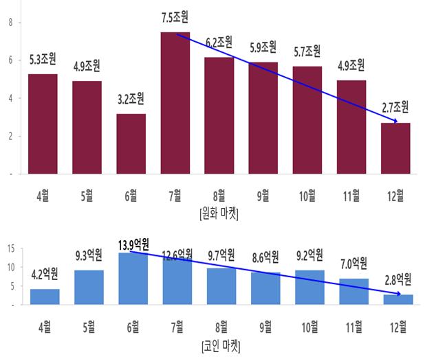 25일 금융위원회와 금융감독원에 따르면 가상자산거래소 18곳의 지난해 하반기 일평균 거래 규모는 5조4천억원으로 상반기 대비 1조원(15%) 줄었다.