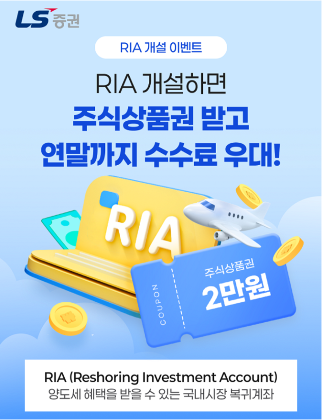 LS증권이 지난 23일 서학개미의 국내 주식시장 복귀를 위한 국내시장 복귀 계좌(RIA)를 출시하고 상품권과 수수료 우대 혜택을 제공하는 이벤트를 진행한다고 25일 밝혔다.
