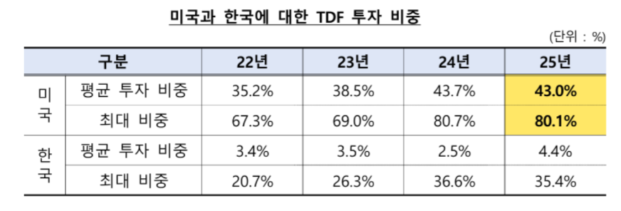 다만 미국 편중이 심해지는 점이 가장 큰 경고 신호로 지적됐다. 2025년 말 TDF의 미국 투자 비중은 평균 43%, 일부 상품은 80.1%까지 올라갔다. 반면 한국 비중은 평균 4.4%에 그친다. 금감원은 4월 1일부터 시행되는 퇴직연금 감독규정 시행세칙 개정을 통해 “해외 특정 국가에 대한 주식·채권 투자 비중을 각각 80% 이내로 제한”했다. 이는 적격 TDF로 인정받기 위한 요건에도 반영돼, 미국 등 한 나라에 ‘몰빵’한 상품은 사실상 퇴직연금 100% 편입이 어려워진다.