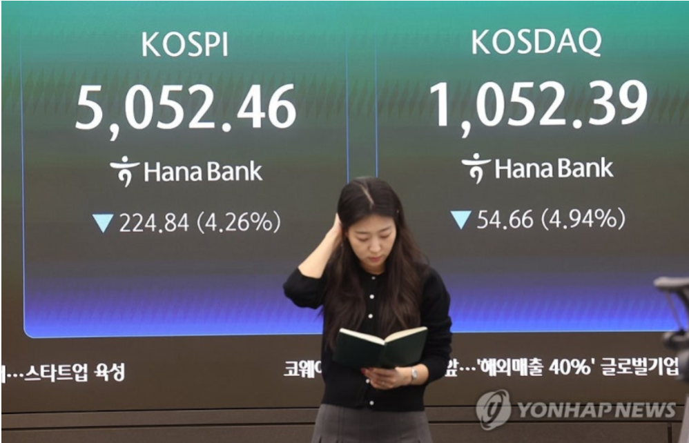 이날 코스피는 전 거래일 대비 224.84포인트(4.26%) 내린 5,052.46에 거래를 마쳤다.