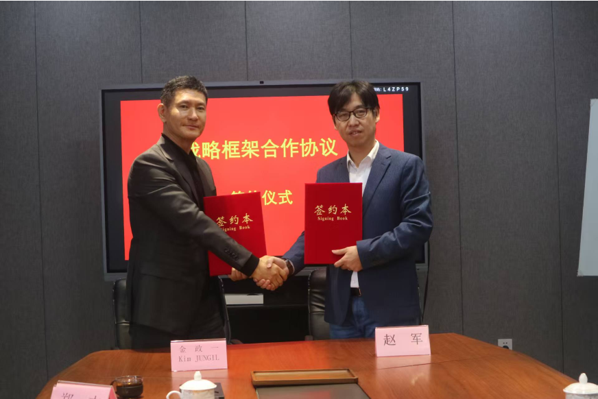 <사진 : 왼쪽부터 김정일 디테크모빌리티 회장, 조군 씽츠자동차회사 총경리>