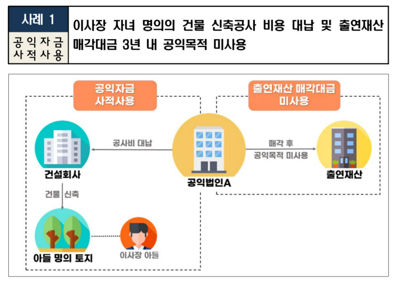 D법인은 출연자의 배우자·자녀·며느리 등 친족을 임직원으로 고용해 인건비를 지급했고, E법인은 출연재산을 매각한 뒤 3년 이내 공익목적에 사용해야 하는 규정을 어겼다.