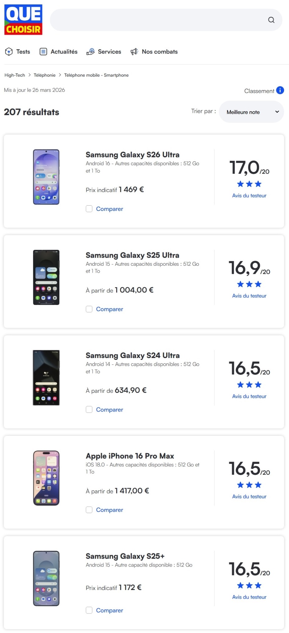 삼성전자에 따르면 갤럭시 S26 울트라는 최근 영국 '위치', 프랑스 '크 슈아지르', 이탈리아 '알트로콘슈모', 스페인 '오씨유', 포르투갈 '데코 프로테스트', 벨기에 '테스트 아차트', 스웨덴 '레드앤론' 등에서 최고의 스마트폰에 선정됐다.