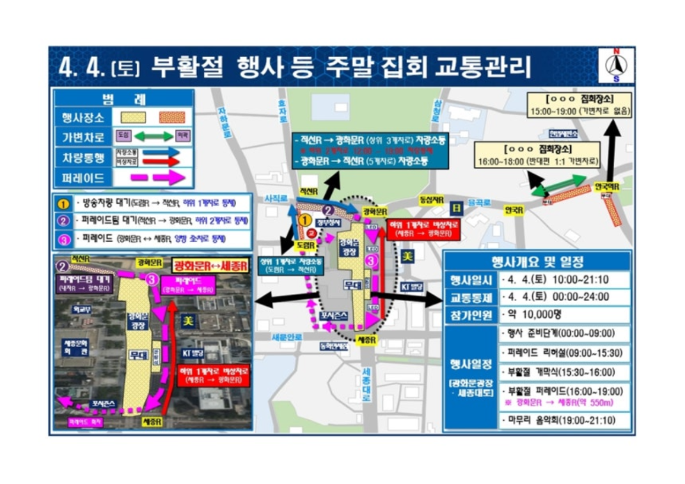 같은 날 도심에서는 종교 행사도 이어진다. 한국교회총연합이 주최하는 부활절 행사가 세종대로 일대에서 열리며, 광화문교차로부터 세종교차로 구간은 4일 0시부터 24시간 전면 통제된다. 다만 긴급차량 통행을 위해 하위 1개 차로는 비상차로로 운영된다.
