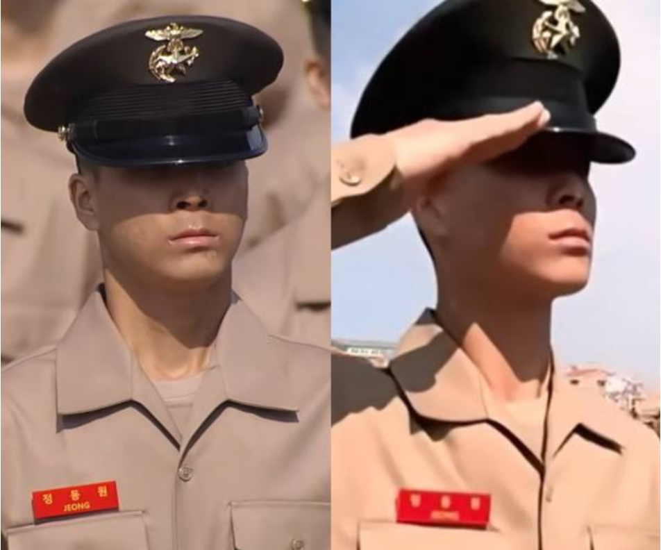 지난 2일 국방홍보원 KFN의 공식 유튜브에는 해병대 1327기 수료식이 생중계 됐다. 이 과정에서 정복을 입은 정동원 모습이 포착됐다.