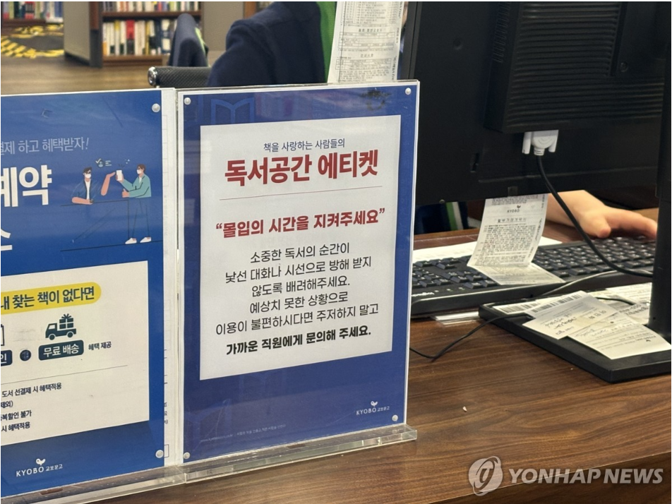 서점 측은 관련 문제를 인지하고 대응에 나섰다. 교보문고는 매장 내 ‘독서 공간 에티켓’ 안내문을 비치해 이용객 간 불필요한 접촉을 자제해 달라고 요청하고 있다.
