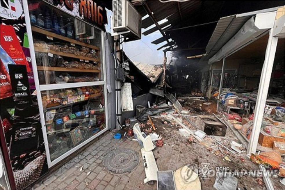우크라이나 당국이 공개한 사진에는 시장 가판대가 부서지고 금속과 유리 파편이 여기저기 널려있었다.