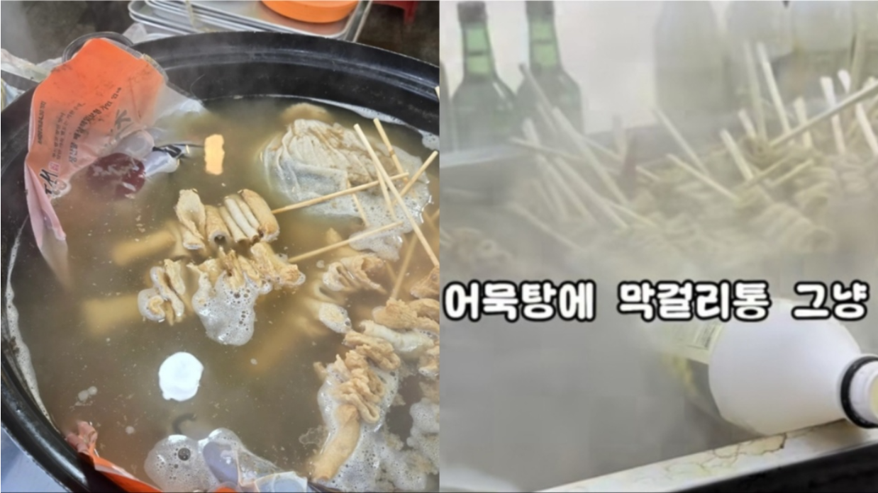 부산에서 열린 축제 현장에서 포장 비닐이 붙은 순대를 그대로 어묵탕 국물에 넣어 데우는 장면이 포착돼 위생 관리 논란이 거세다.
