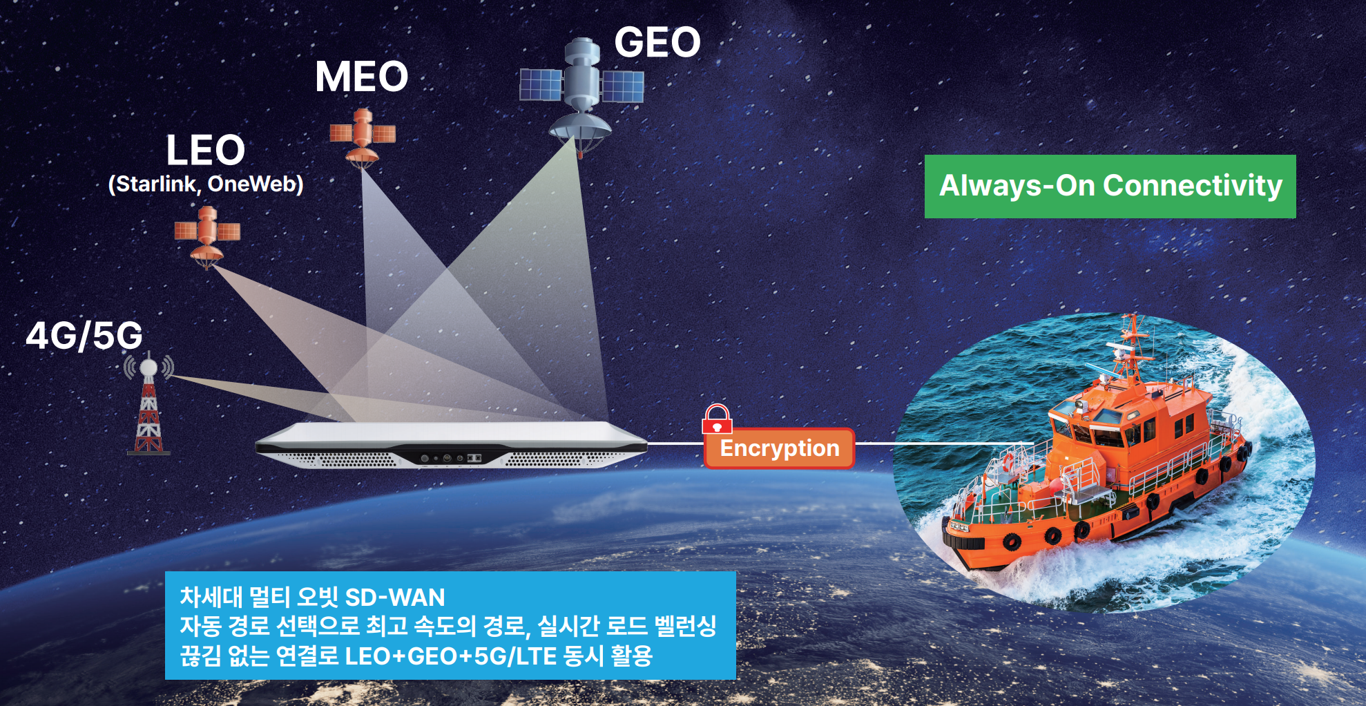 5G/LTE, LEO(스타링크, 원웹) 및 GEO 등 멀티오빗(Multi Obit)으로 다중 무선통신 환경에서 지하터널이나 도심속에서 안정적인 고속 데이터 통신을 구현하는 차세대 SD-WAN(Software-Defined Wide Area Network) 안테나를 개발했다.