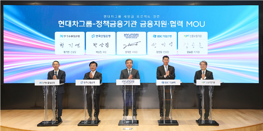 한국산업은행은 6일 본점에서 이억원 금융위원장, 박상진 한국산업은행 회장, 장민영 IBK기업은행 은행장, 황기연 한국수출입은행 은행장, 강승준 신용보증기금 이사장, 현대차그룹 장재훈 부회장이 참석한 가운데 현대차그룹의 새만금 프로젝트에 대한 현대차그룹·정책금융기관간 금융협력에 대한 MOU를 체결했다고 밝혔다.