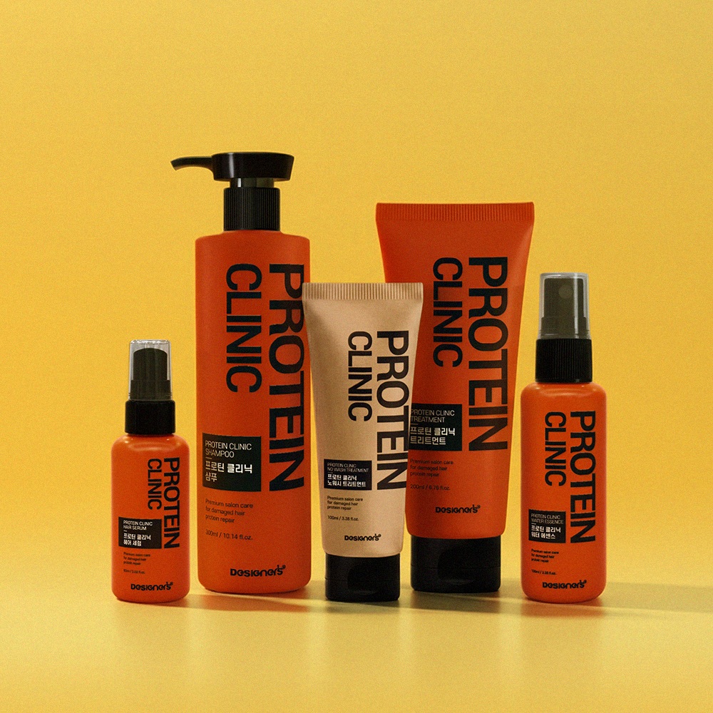 첫 번째 론칭 라인업인 'PROTEIN CLINIC(프로틴 클리닉)' 5종은 DESIGNER'S의 브랜드 철학을 가장 직접적으로 구현한 제품군이다. 모발 탄력의 근본을 복원하는 샴푸를 시작으로, 고농축 트리트먼트, 헹굼 과정을 생략한 노워시 트리트먼트, 수분 충전용 워터에센스, 영양 공급을 마무리하는 헤어세럼까지 총 5종으로 구성되어 손상모 케어의 전 과정을 하나의 완성된 홈케어 시스템으로 구축했다.