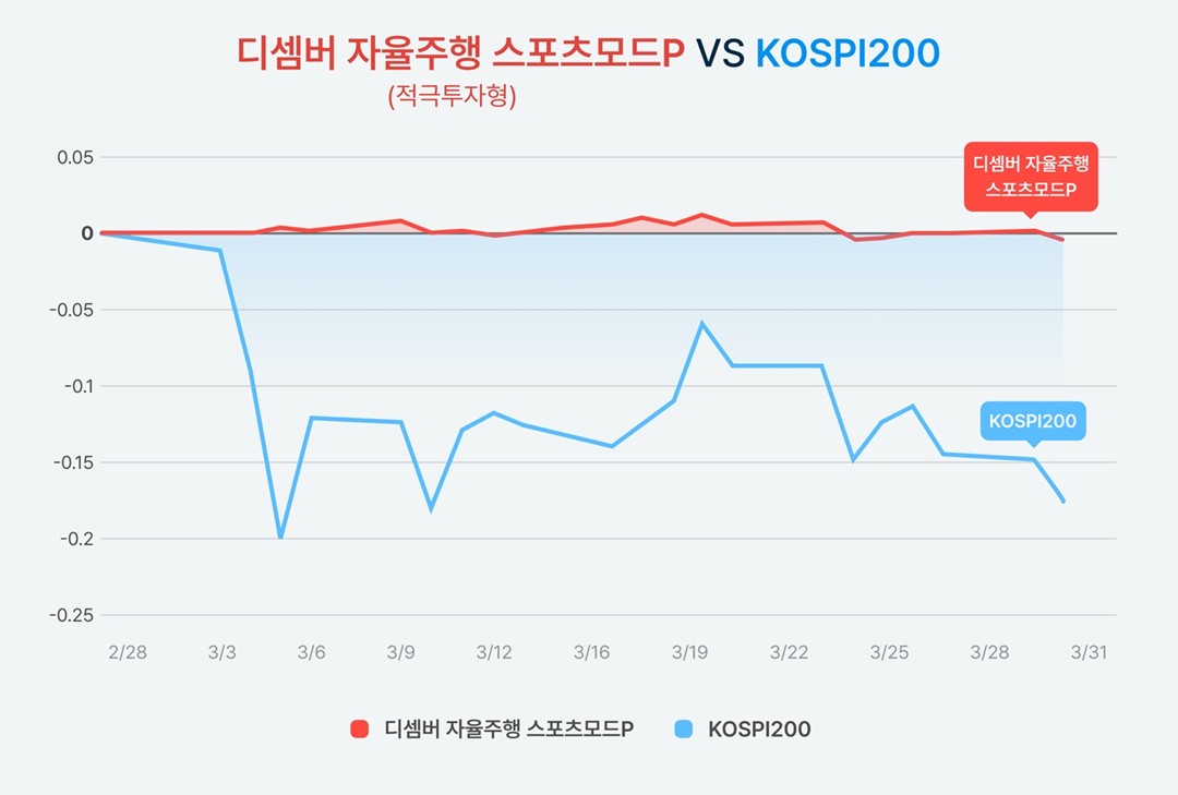 중동 전쟁 발발 이후 1개월이 지난 3월 31일 기준, 코스피200이 -17.34% 하락한 것과 달리 디셈버 자율주행 ‘스포츠모드P(적극투자형)’는 -0.39%의 수익률을 기록하며 하락장 속에서도 안정적인 흐름을 유지했다.