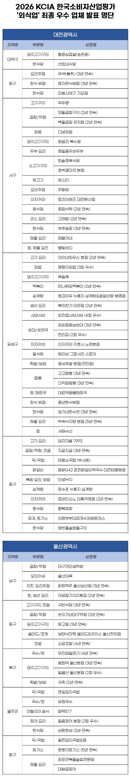 KCA한국소비자평가는 대한소비자협의회가 주최하고 한국소비자평가가 주관하는 <2026 KCIA 한국소비자산업평가 ‘외식업’> 대전, 울산 지역 평가 결과를 발표했다.