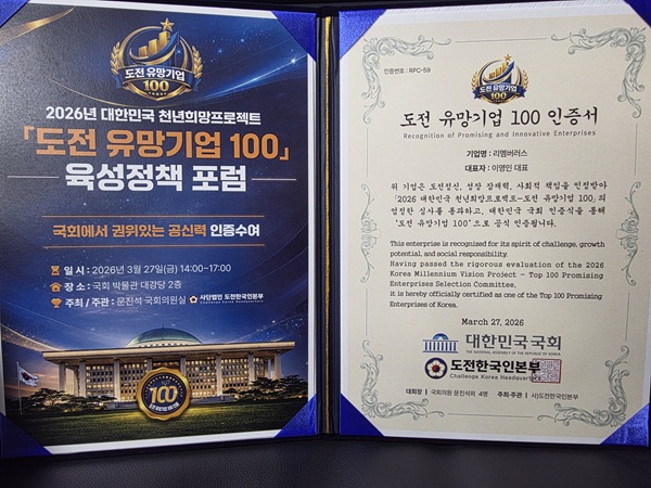 (주)리멤버러스 이영인 대표가 3월 27일 국회 박물관 대강당에서 열린 ‘2026 대한민국 청년희망프로젝트-도전 유망기업 100 육성정책포럼 및 인증식’에서 ‘도전 유망기업 100’ 인증서를 수상했다고 밝혔다.