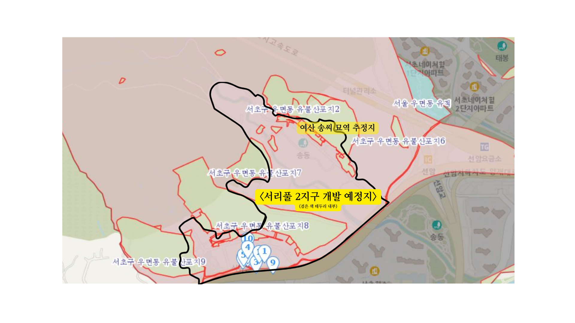 서리풀2지구 주민들은 영화 '왕과 사는 남자'로 관심을 모은 단종의 장인 여산 송씨의 묘역 추정지 7,500평 중 약 40%가 개발 예정지에 포함된 것으로 추정된다며 “묘역이 원래 모습 그대로 보존되기를 간절히 호소하고 있다”고 밝혔다.