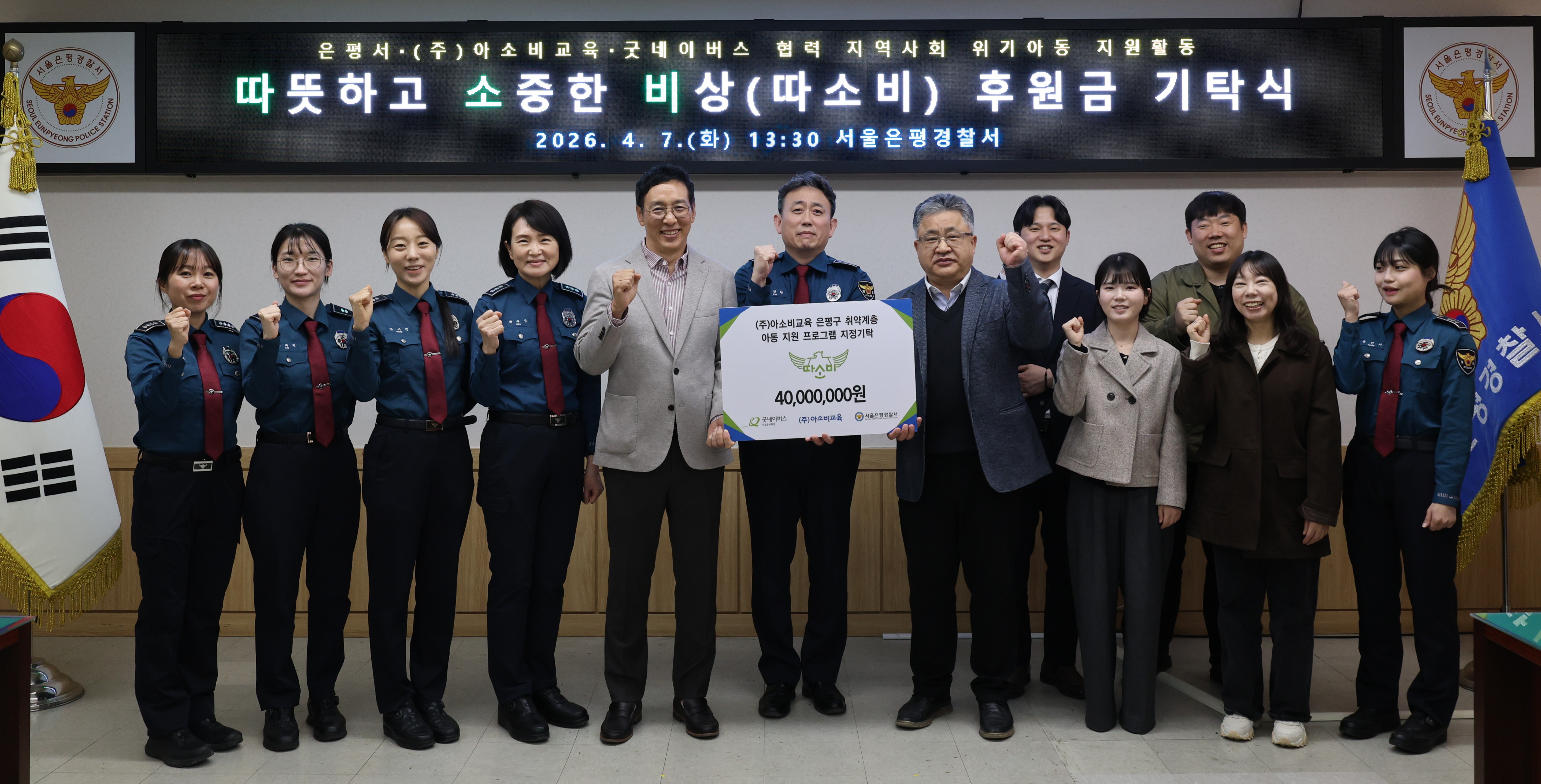 이와 관련해 지난 4월 7일, 서울은평경찰서에서 기탁식을 열고 굿네이버스 서울중부지부에 후원금 4,000만원을 전달했다고 밝혔다. 행사에는 김정훈 ㈜아소비교육 상무이사, 문기덕 굿네이버스 서울중부지부장, 김현환 서울은평경찰서장 등 주요 관계자들이 참석했다.