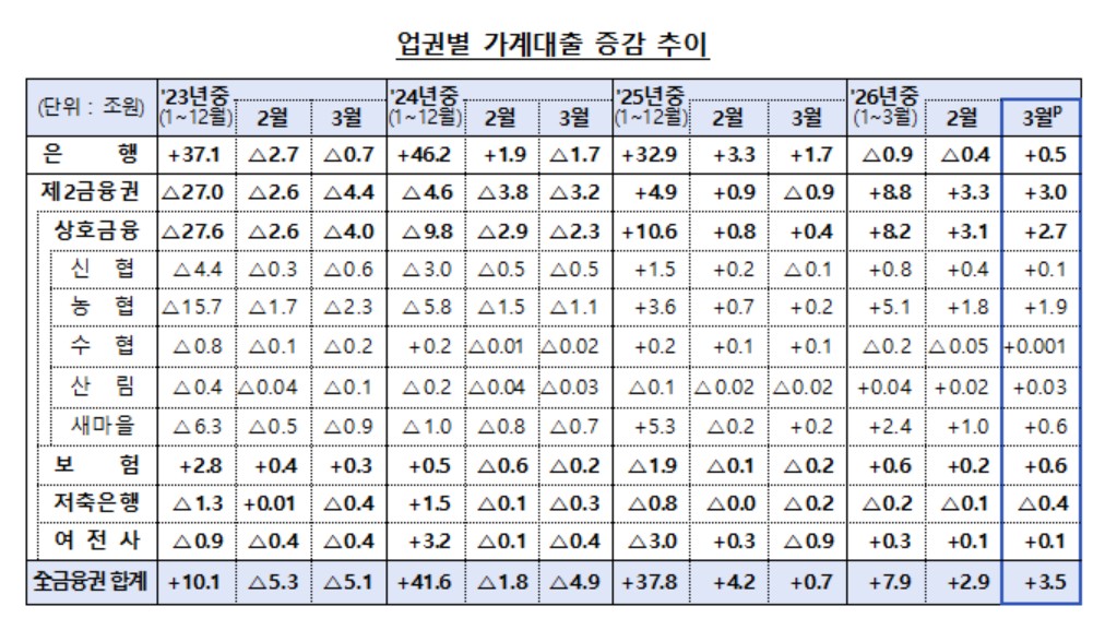 업권별로는 은행이 5천억원, 2금융권이 3조원 늘었다.