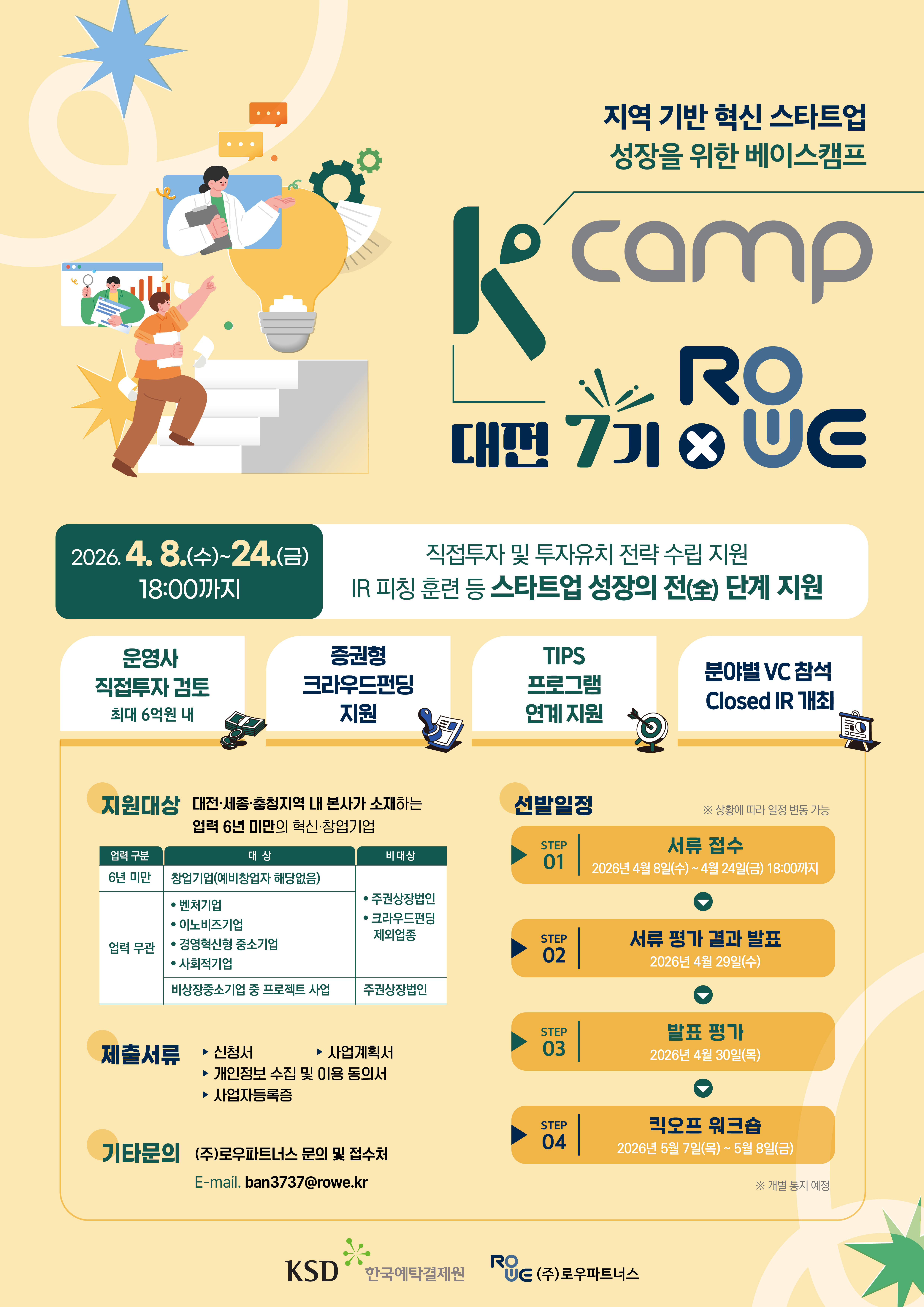 한국예탁결제원이 대전·세종·충청 지역의 혁신 창업 생태계 활성화를 위해 ‘K-Camp 대전 7기’ 프로그램 참가기업 모집에 나선다고 밝혔다.