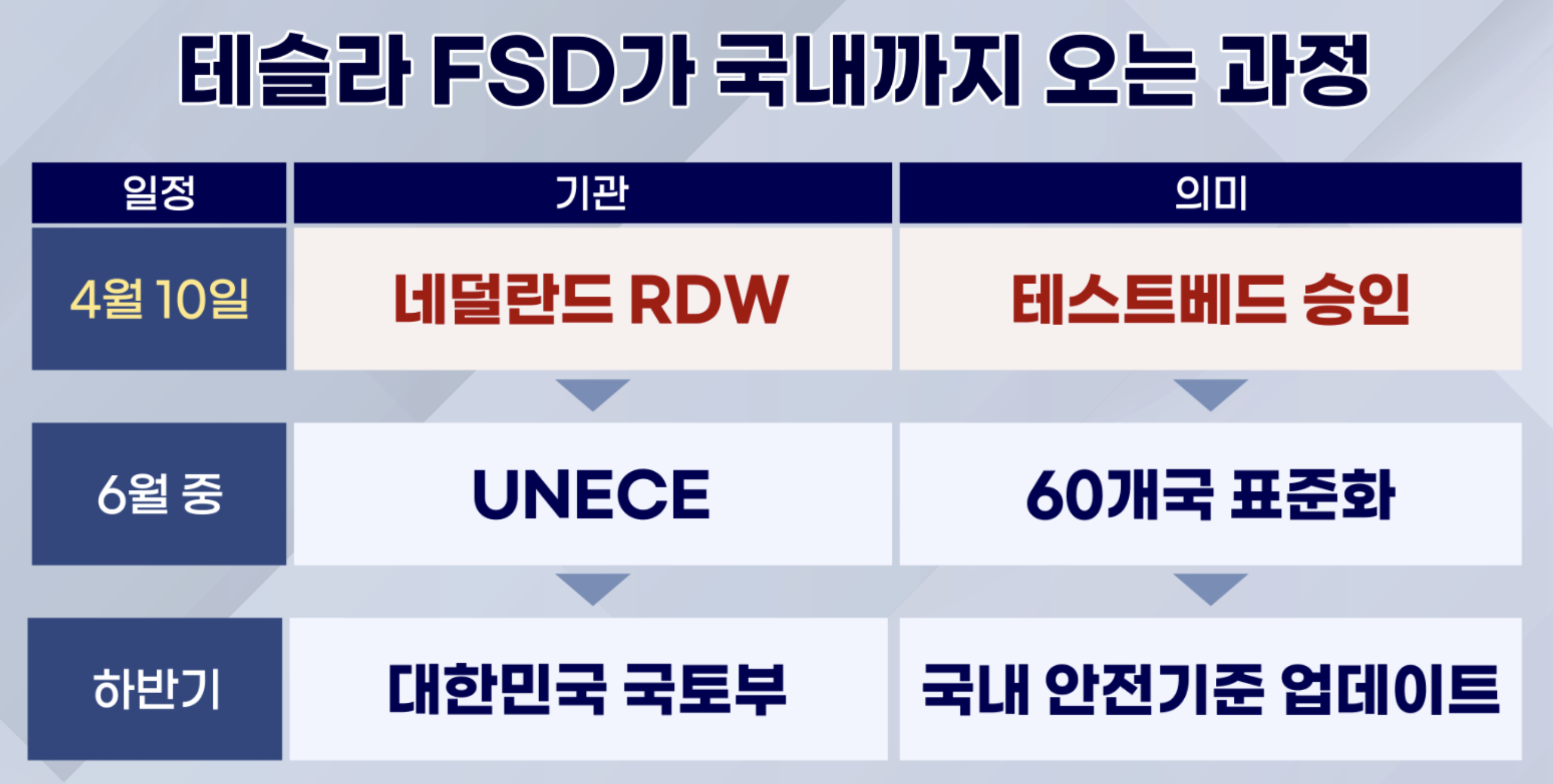 테슬라의 유럽 내 자율주행 테스트베드인 네덜란드에서 안전성이 입증돼 허가가 난다면 이는 곧 국제 표준 기구의 공인 데이터가 됩니다. 한국 정부가 국내 법규를 개정할 강력한 명분과 근거가 마련되는 셈인데, 결국 네덜란드의 승인이 한국 도로의 빗장을 여는 첫 단추인 겁니다.