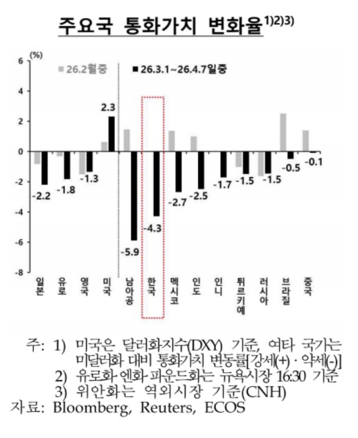 달러 강세에 비해 원화 약세폭도 더 컸다. 3월부터 4월 7일까지 미국 달러화는 2.3% 강세를 보였고 원화는 4.3% 약세를 보였다. 일본(-2.2%), 유로(-1.8%)는 물론 멕시코(-2.7%), 인도(-2.5%) 등과 비교해도 약세가 두드러졌다.