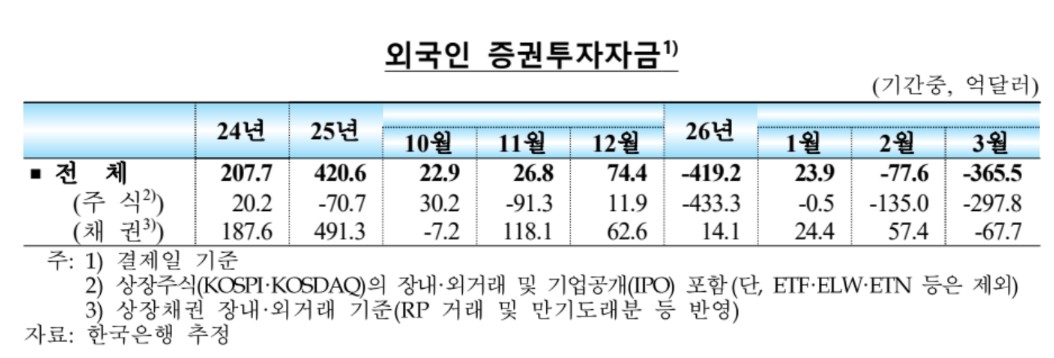 한국은행 관계자는 "주식자금 순유출은 차익실현과 중동 전쟁 영향이 컸고, 채권은 3월 국고채 만기상환과 재투자 부진으로 순유출 전환했다"고 설명했다.