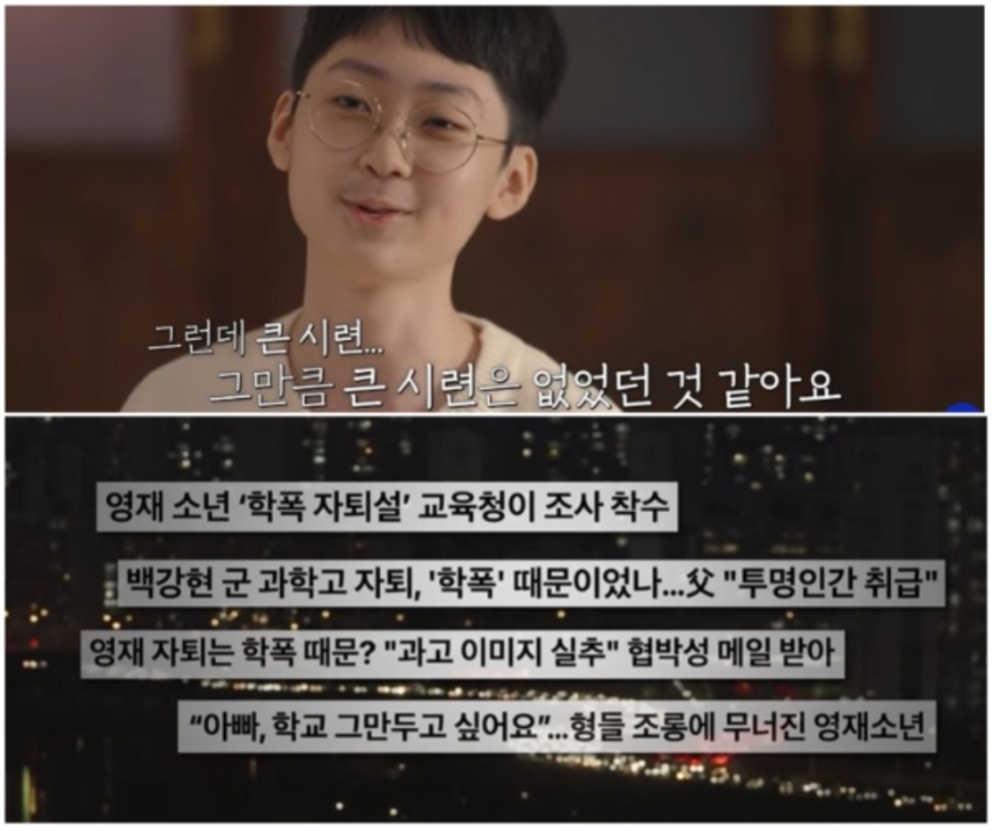 앞서 백강현의 아버지도 유튜브를 통해 "강현이가 학업을 따라가지 못해 학교를 그만둔 것이 아니라, 경찰 고발 직전까지 갈 만큼 학교폭력 상황이 심각했다"고 밝힌 바 있다.