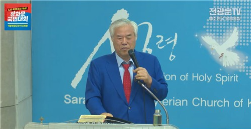 전 목사는 이날 오전 종로구 동화면세점 앞에서 열린 '전국 주일 연합예배'에서 화상으로 등장해 설교를 했다. 이는 스크린으로 신도들에게 방영됐다.