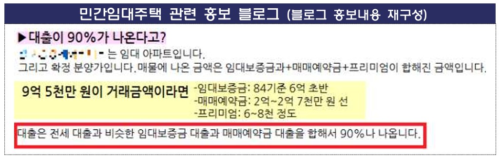 이번 조치는 일부 민간임대주택 사업장에서 분양전환을 조건으로 '매매예약금' 납입을 권유하는 사례가 발생한 데 따른 것이다. 일부 블로그, SNS 등에서 '매매예약금'을 금융사 전세대출 등을 통해 납부할 수 있다는 내용이 홍보되고 있는 것으로 확인됐다.