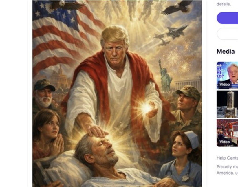 트럼프 대통령 주변에 광채가 나고 왼손에 환한 빛이 나는 무언가를 들고 있는 모습인 이 이미지는 거의 종교화를 연상케 한다. 이는 인공지능(AI)으로 생성한 것으로 추정됐다.