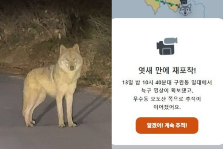 이어 "어제 오후 10시 42분께 구완동 산길에서 발견해 급히 119에 신고했다"며 "늑대보다는 대형견처럼 보였고 겁도 조금 먹은 것 같았다"며 "전혀 공격적이지 않았는데 살짝 경계하더니 살금살금 도망가더라"고 덧붙였다.