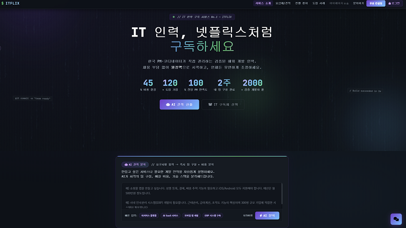 ITFLIX는 최근 'AI 기반 즉시 견적 시스템'을 도입했다. 기업이 개발하려는 서비스 유형과 규모를 입력하면, AI가 수초 내에 필요한 팀 구성과 월 예상 비용을 자동 산출한다. 번거로운 대면 미팅이나 긴 대기 시간 없이 신속한 의사결정이 가능하다.