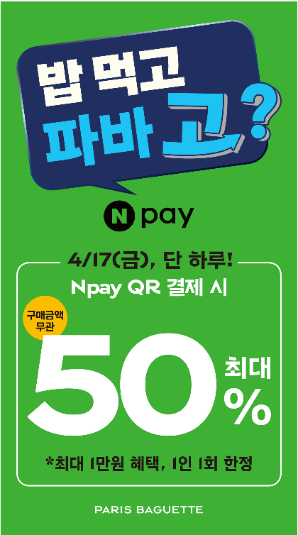 행사 당일 파리바게뜨 매장에서 Npay(머니·포인트·카드) QR결제로 단독 결제하면, 구매 금액 제한 없이 최대 1만원까지 50% 할인을 받을 수 있다. 해당 혜택은 1인 1회 제공되며, 통신사 혜택·모바일상품권·기타 할인 행사와는 중복 적용되지 않는다.