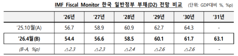 IMF는 한국의 GDP 대비 일반정부 부채 비율을 2026년 54.4%, 2027년 56.6%, 2028년 58.5%, 2029년 60.1%, 2030년 61.7%, 2031년 63.1%로 전망했다.