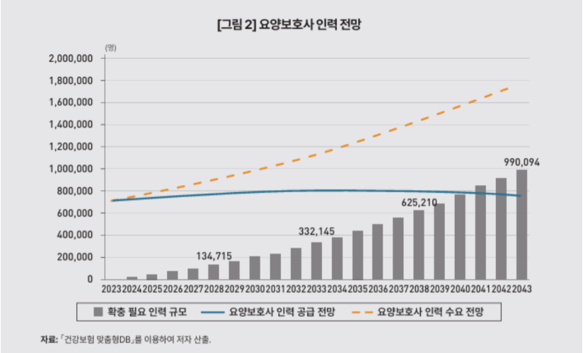 KDI는 "현재 요양보호사 인력의 업무 부담 수준을 유지하기 위해 2043년 99만 명이 추가적으로 필요하다"고 설명했다.