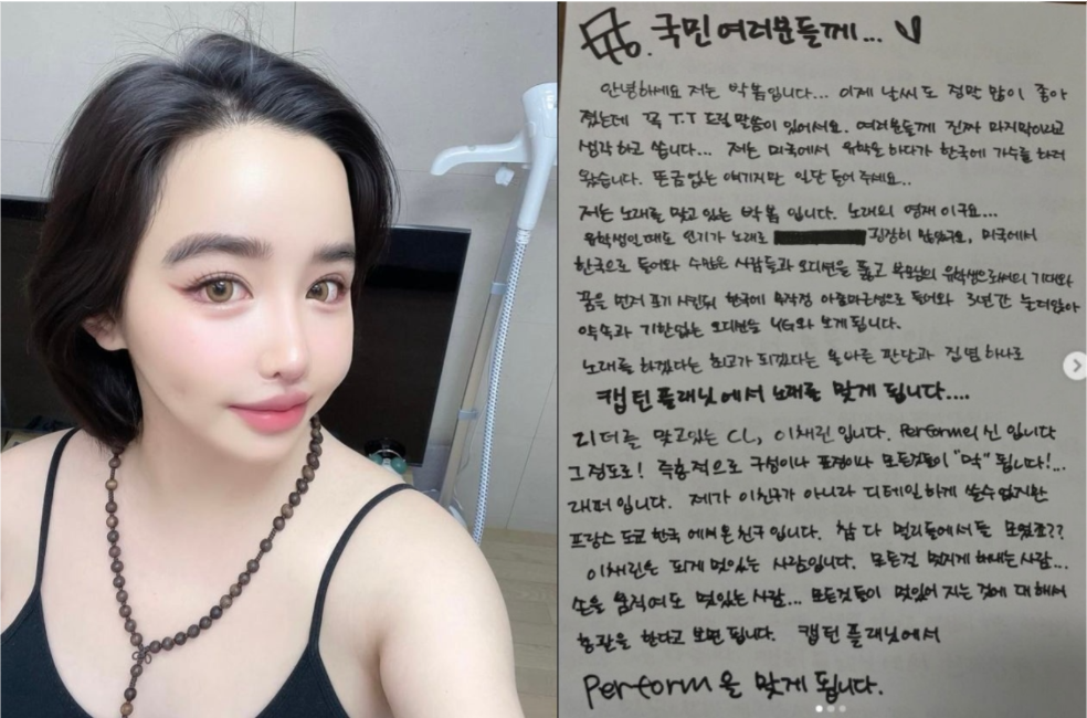 박봄은 17일 자신의 SNS에 "국민 여러분들께"로 시작하는 장문의 손편지 3장을 올렸다.