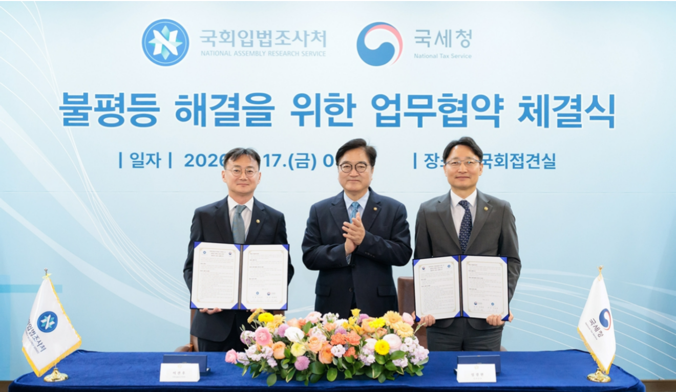 국세청은 17일 우원식 국회의장 주재로 국회입법조사처와 불평등 해결을 위한 행정데이터 활용 협력 강화 업무협약(MOU)을 체결했다.